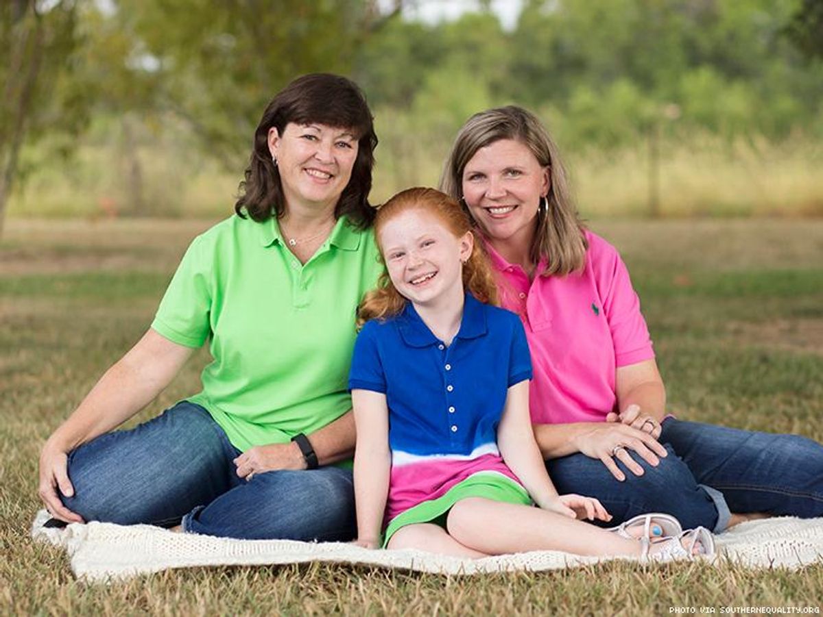 The state contends that the couples lack standing to bring the suit because they have not actually attempted to go through the legal process of adopting. One new filing by the plaintiffs' attorneys counters, "As the targets of the Mississippi Adoption Ban, they have clearly suffered an 'injury in fact' that is more than sufficient for standing in this type of equal protection challenge and is not negated by the fact that Plaintiffs have not taken the expensive, time-consuming, and futile step of filing for adoption." (Plaintiffs Janet Smith and Donna Phillips are pictured above with their daughter, Hannah Marie Phillips; under current law, Smith is not recognized as a legal parent.)