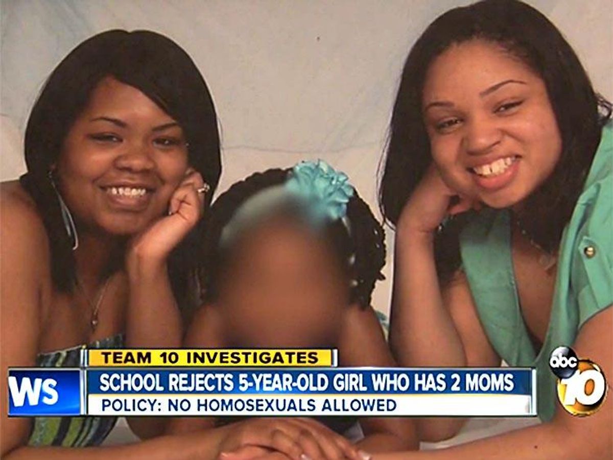 A woman who identified herself as "Kailyn" and as the director at Mt. Erie Christian Academy in San Diego was asked by KGTV if the girl was not welcome in the school's kindergarten because she has two moms. The station reported Kailyn stated that the school does have a non-discrimination policy, but when asked whether it was discrimination to bar the 5-year old from attending kindergarten because her parents are lesbians, she responded: