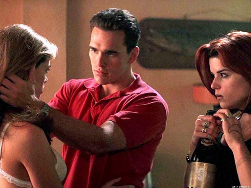 The sexy thriller centers around the misdeeds of Sam Lombardo, played by Matt Dillon, a guidance counselor accused of raping two girls at his high school, portrayed by Denise Richards and Neve Campbell. As the story unfolds, it's revealed he's in cahoots with both of the teenage girls to swindle a settlement and having a torrid affair with both.