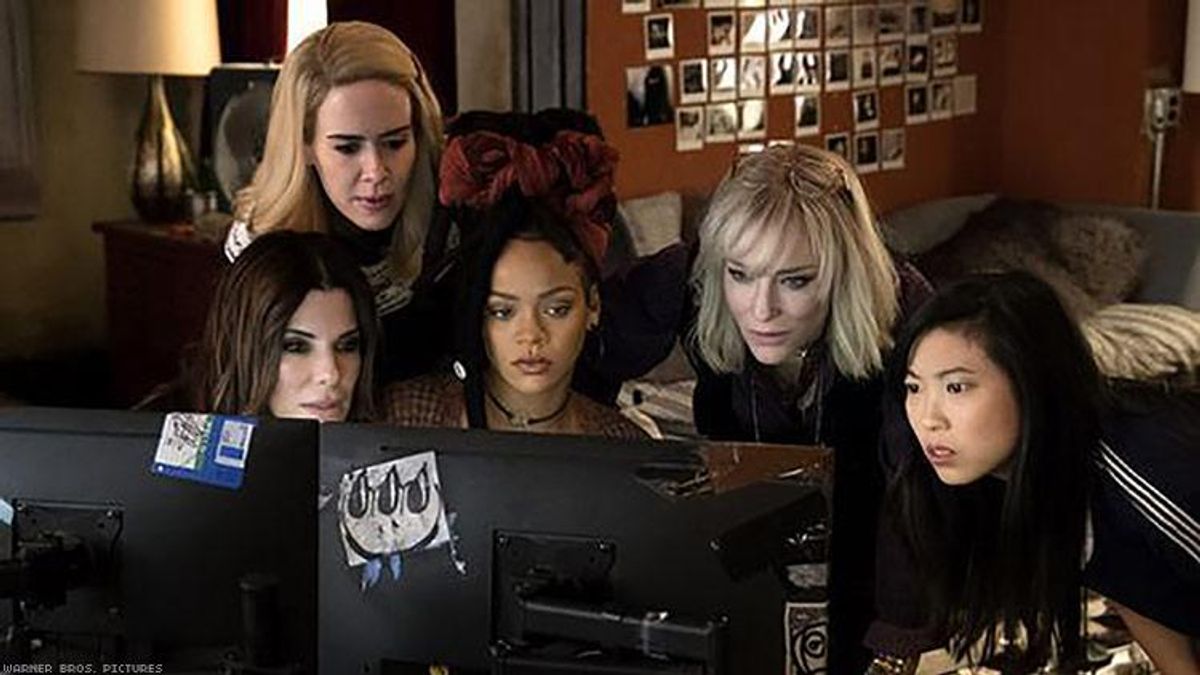 The new trailer, set to the Linda Ronstadt classic "You're No Good," features Sandra Bullock's Debbie Ocean (sister of George Clooney's Danny Ocean), fresh off of a five-year-plus stint in prison and planning a massive heist to hit the Metropolitan Museum of Art in New York City. Among those who stand to put a cool $16.5 million in their pockets if they pull off the gig are her most trusted ally, Lou (a wonderful trouser-sporting Cate Blanchett); Tammy (Sarah Paulson), recently retired from the criminal life; Mindy Kaling as the jewelry maker Amita; tech expert Nine Ball (Rihanna); pickpocket Constance (Awkwafina); and the quirky seamstress Rose (Helena Bonham Carter). Anne Hathaway stars as Daphne, the actress whose necklace they conspire to pocket during a major gala.