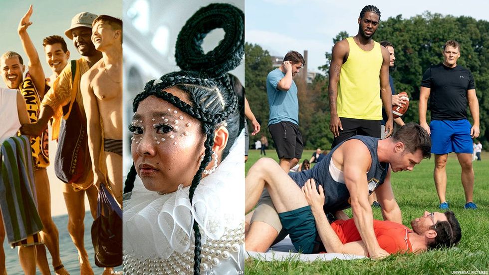 Pictured, from left: Scenes from Fire Island, Everything Everywhere All at Once, and Bros