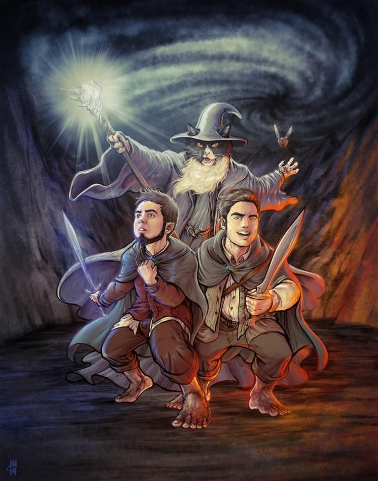Portrait commission of Jeffrey and Mike with their cat Gandalf, as characters from The Lord of the Rings