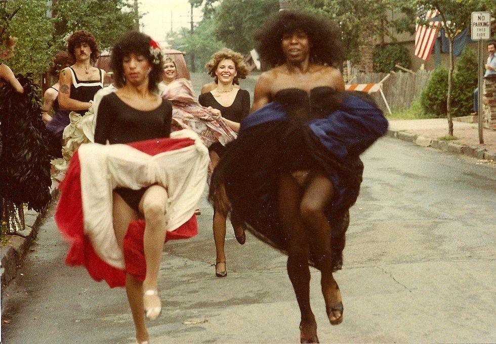 She continues on, “This Bastille Day celebration in 1975 took place on Mechanic St. in downtown New Hope with a block party and everyone in town, all ages, were invited. There was dancing in the streets as well as a ‘drag race’ where anyone, especially those in drag, could enter to race up Mechanic St. hill and back down.”