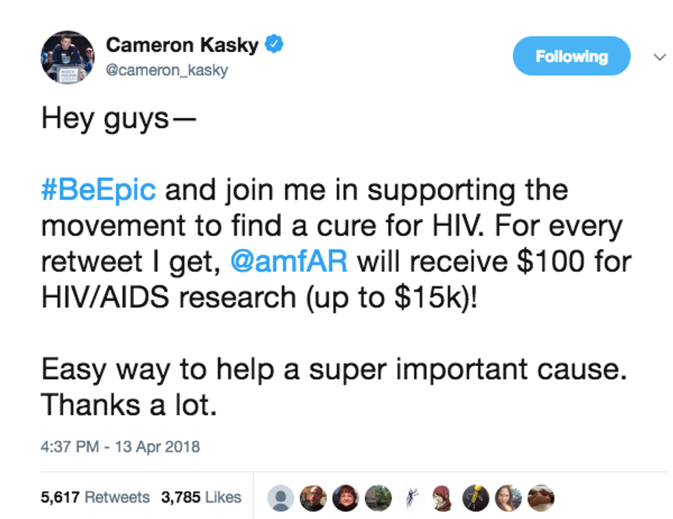 Simply retweet Kasky's tweet and amfAR will receive one hundred dollars. You can follow and retweet Kasky @Cameron_Kasky.