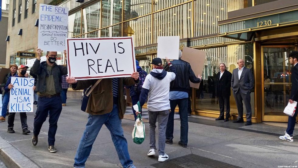 Protesters organized by GLAAD and ACT UP New York demonstrated Monday at Simon & Schuster’s headquarters in Manhattan to demand that the publisher cease distributing a book that questions if HIV causes AIDS.
