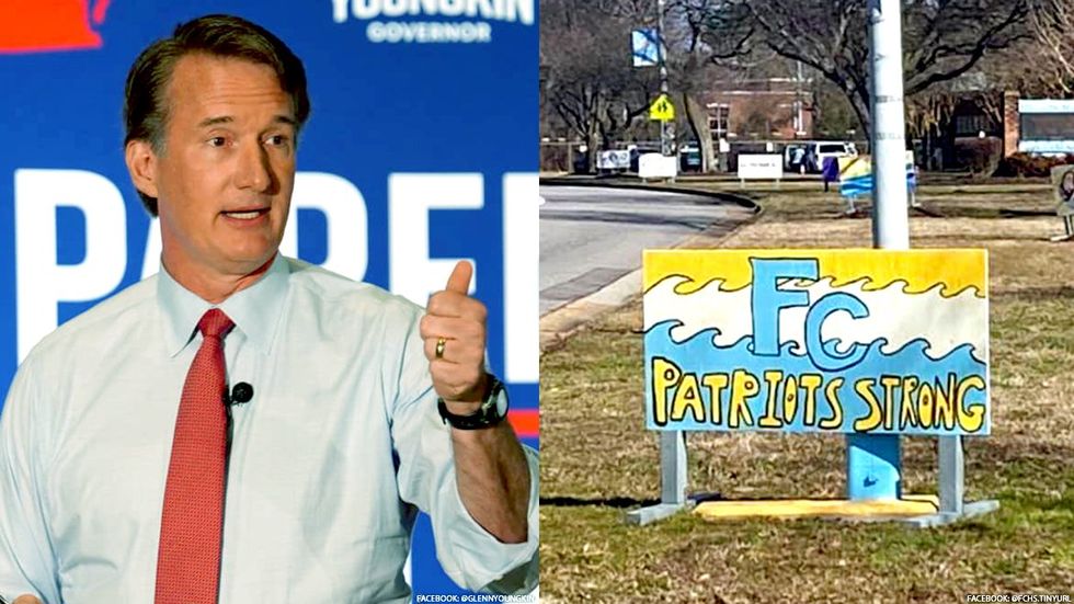 Pictured: Virginia Gov. Glenn Youngkin and a sign at First Colonial High School in Virginia Beach