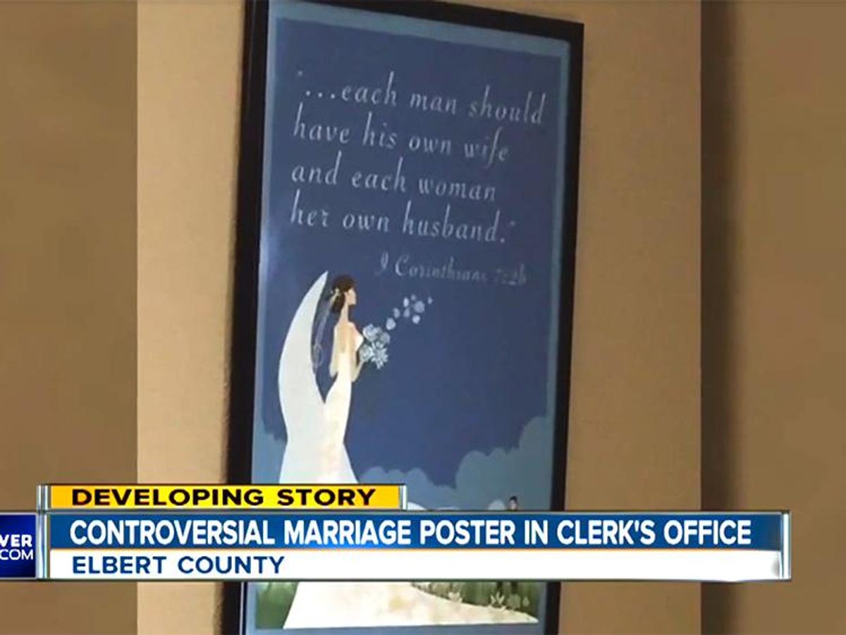 Dallas Schroeder, the clerk of Elbert County, a largely rural district southeast of Denver, told KMGH that the poster is simply a "celebration of marriage." He claimed the poster has been visible in the office for the past 15 months, and that he has received no complaints about its religious message in a public building.
