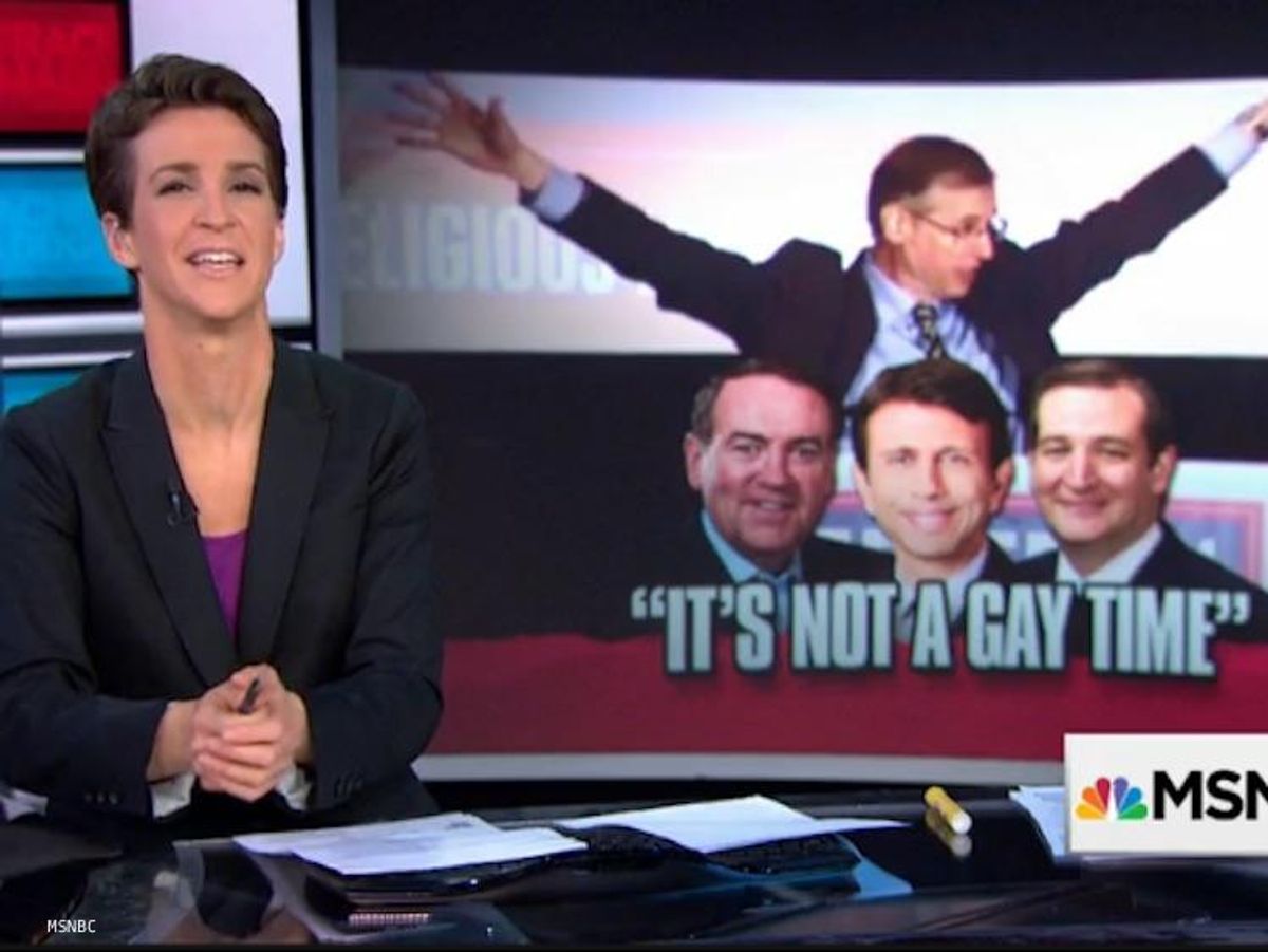 "This was a Republican presidential candidates event," Maddow told viewers. "These were not the 'kill the gays' ravings of the guy hosting this event from some time in his past. This was not something we dug up that he said a long time ago, that maybe these presidential candidates didn't know about." Maddow suggested the might be a good topic for the moderators from Fox Business Network who will put questions to Cruz and the other Republicans running for president Tuesday night.