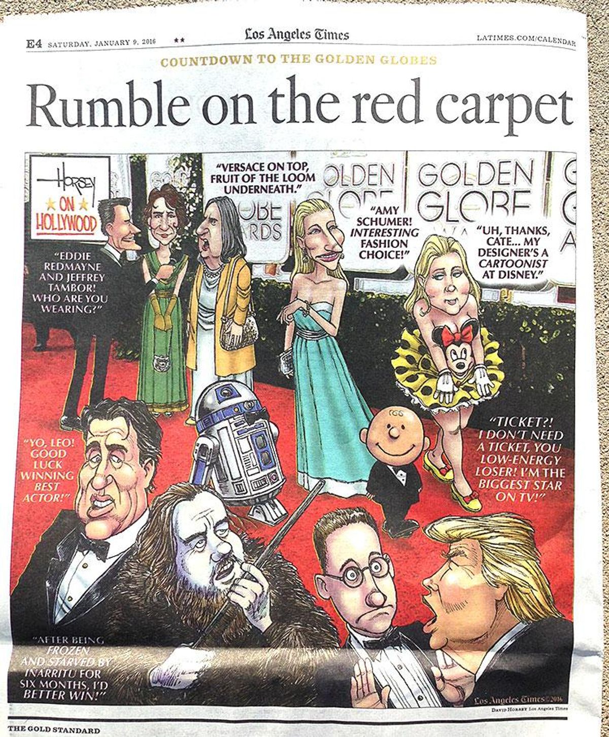 One week ago today, readers of the Los Angeles Times saw an editorial cartoon depicting celebrities at the Golden Globes, an artist's imaginative interpretation of the scene he expected to play out in Hollywood last Sunday night, although not all of it came true.