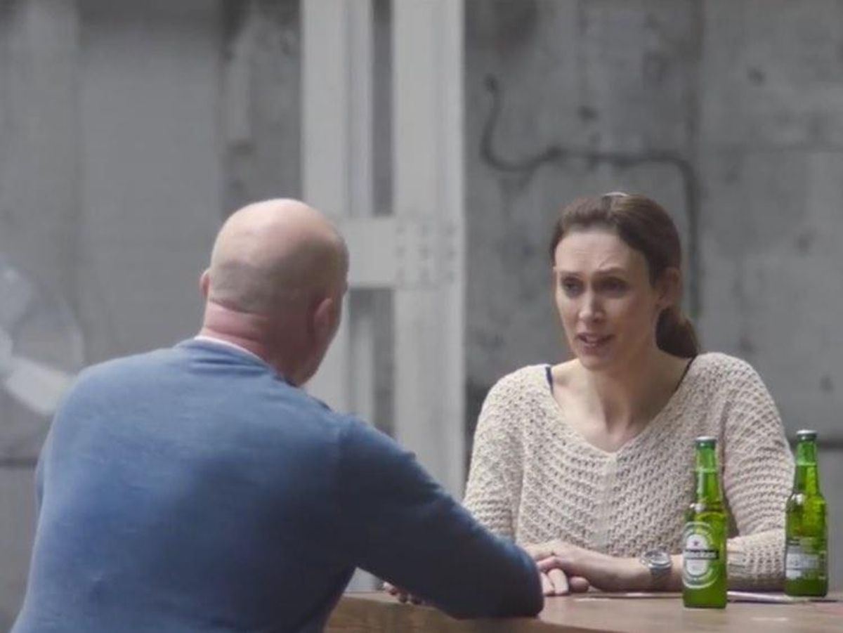 In the four-minute Heineken "Worlds Apart" spot (watch below) three pairs of people, who are reportedly not actors, work together to build a home bar, then watch video clips of each other revealing their clashing views on issues including transgender acceptance, feminism, and climate change. They then must decide whether they still want to have a conversation over a Heineken.