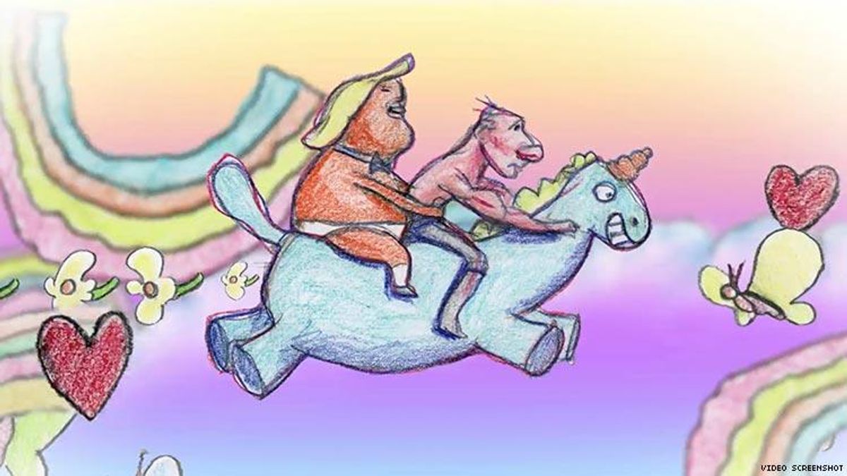 The New York Times is responsible for the latest ugly example of conflating the acts of nihilistic world leaders bent on destroying democracy with that of love between men in an illustrated video on its digital opinion page. The video, titled "Trump and Putin: A Love Story," depicts Trump primping and using breath spray while awaiting the arrival of his suitor, Putin. Trump then hops into a car with the homophobic leader of Russia where they eventually hold hands and vigorously tongue one another until their vehicle magically becomes a unicorn flying over rainbows.