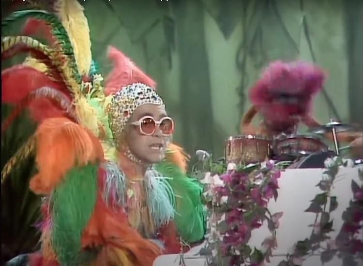 Lil Nas X pays homage to vintage Elton John's feathered glam look in their Uber Eats collaboration. Renowned for his outlandish costumes at the time, John debuted the Bob Mackie design when he performed "Crocodile Rock" on The Muppet Show in the early 1970s.