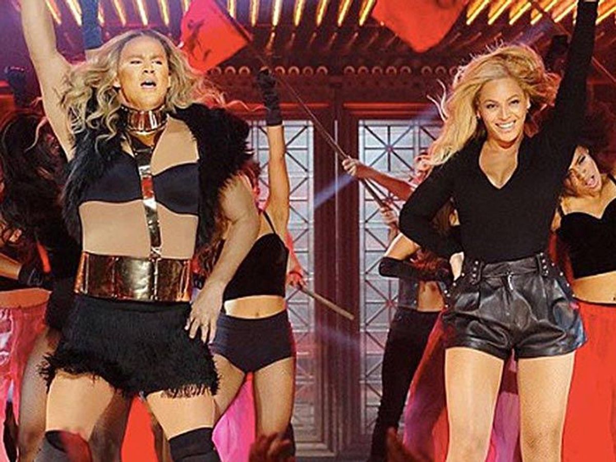 Never mind who runs the world, who wore it best? Bey's black bustier, fur bolero and shorts, a gold choker, and oh, those luscious blond locks!