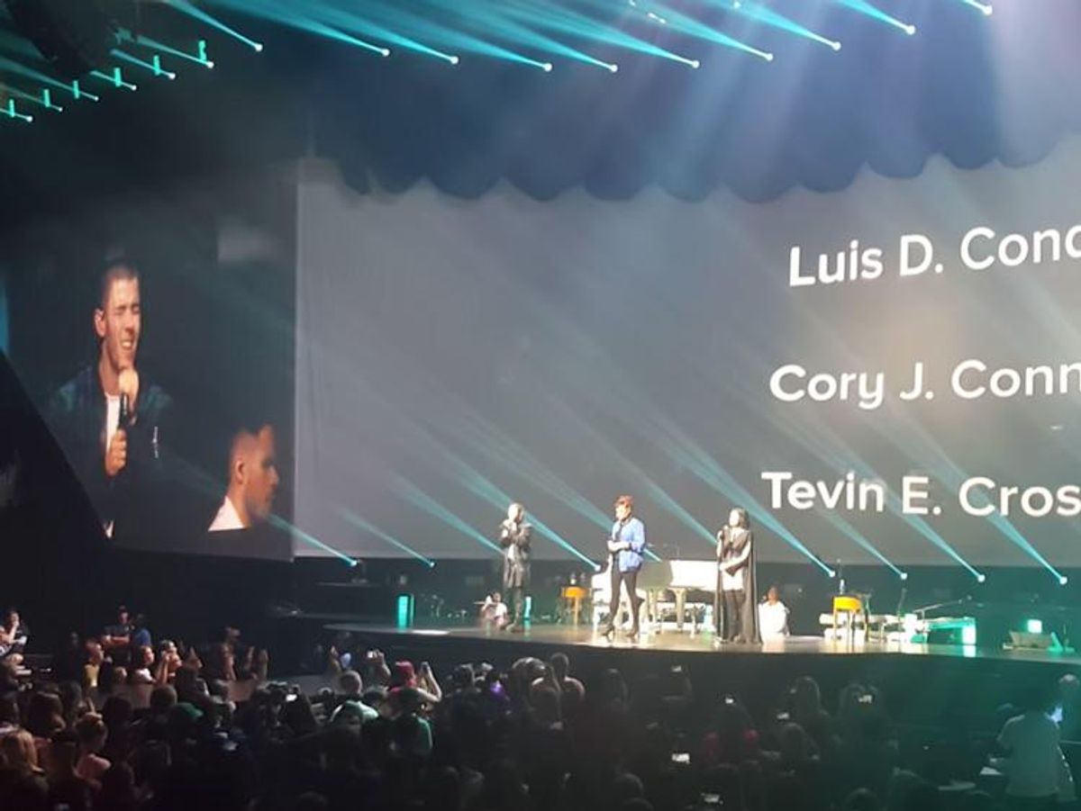 The two were joined onstage at the Amway Center by Andra Day for a stripped-down rendition of that singer's "Rise Up." Before the surprise performance, Jonas and Lovato welcomed a man named Hank to the stage who led a prayer for the 49 victims, plus the Voice singer, Christina Grimmie, who had been killed in Orlando before the mass shooting.