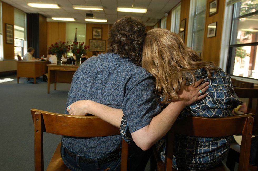 A lesbian couple wait to apply for a marriage license in Northampton, Massachusetts, on May 17, 2004.