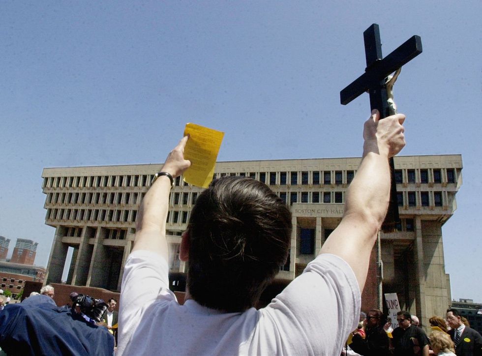 An opponent of same-sex marriage protests during a rally at City Hall on May 17, 2004 in Boston, Massachusetts.
