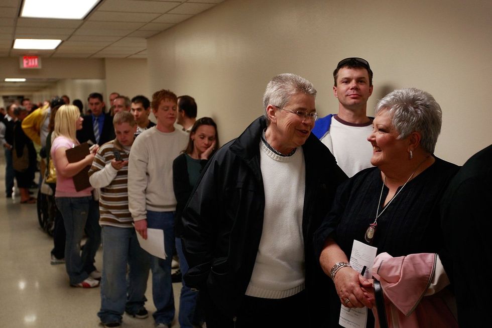 LGBTQ+ couples wait in line to request marriage licenses on April 27, 2009 in Des Moines, Iowa.