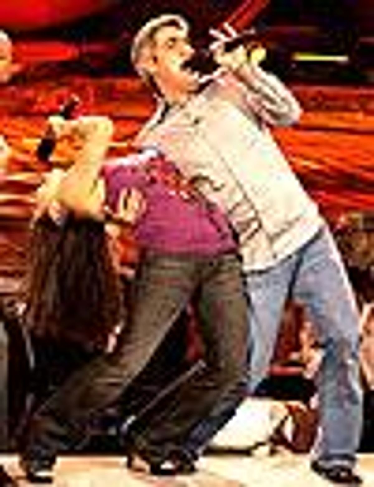 During "Hotel" Hicks is the soloist, and he gets so into the "been so lonely" bit that he almost forgets that he's needed onstage. He jogs to it, making a quick pit stop to look directly into some woman's lap, then leaps up the steps just in time for Areyoulonesometonightlovemetender...