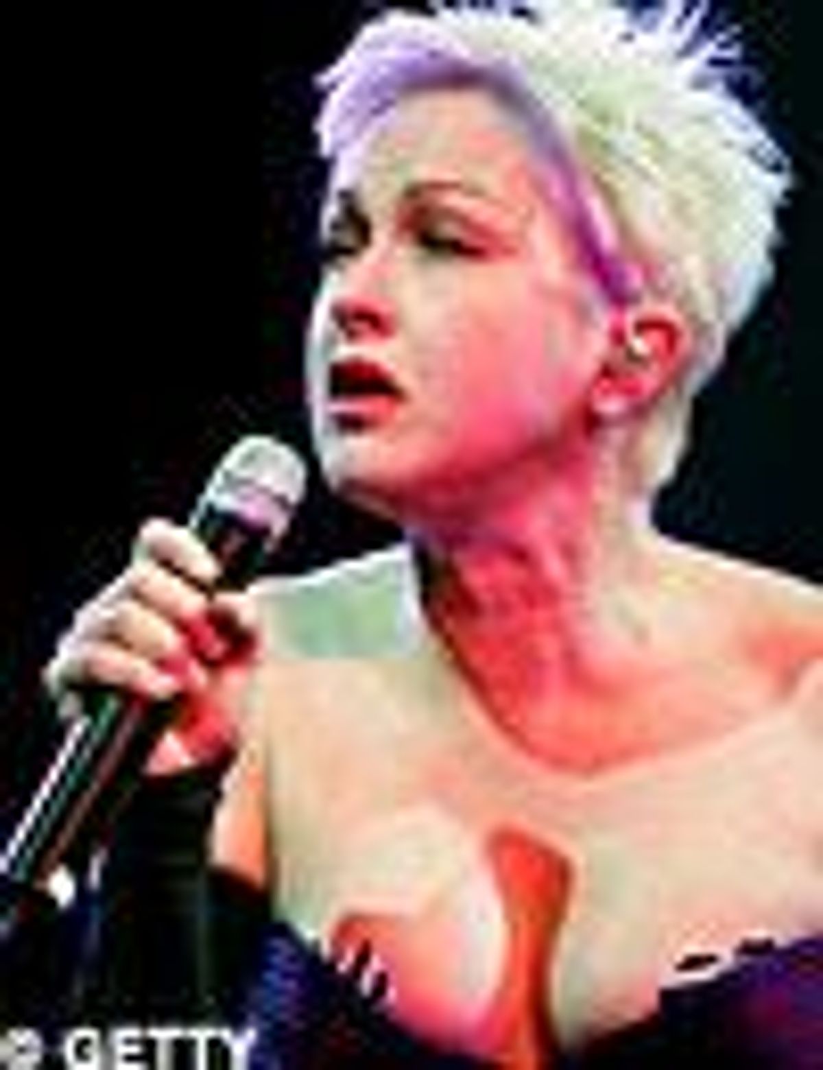 Now, I've seen Erasure before, and they were good. But on the gayest of gay nights, Andy Bell was no-holds-barred. Backed by a Dreamgirls homage of chorus girls in Japanese dresses and black bobbed wigs, he minced, pranced, posed, strutted, skipped, and generally bounded about from limp-wristed to dominating. The baby boomers were dancing in a sea of off-beat clapping, slightly spastic booty wiggling, and general abandon. This was a crowd that didn't care who was looking--a rarity in our gay universe. The excitement in the air was palpable when Margaret took to the stage for her last bit, a very funny rap about her mean neighbors' "pussy," which she performed as her mother, complete with curly wig, dark glasses, and high-waisted polyester pants. As she finished, a strange figure in a long black wig walked up to whisper something in her ear. But no wig could hide that thick Brooklyn accent, and the crowd went crazy. It was Cyndi. But instead of performing, she gave a little speech about HRC and Mathew Shepard and introduced a short video to help inspire us to action. "You watch this, and I will be back in a few minutes," she said. looking like a Jewish grandmother with her hunched shoulders and extreme gestures. The clip was a bit of a downer, I must say, but it inspired a mood of political activism. When the lights came up, she was standing onstage in super-high black heels and a Chinese rice farmer hat made of rainbow-colored straw.