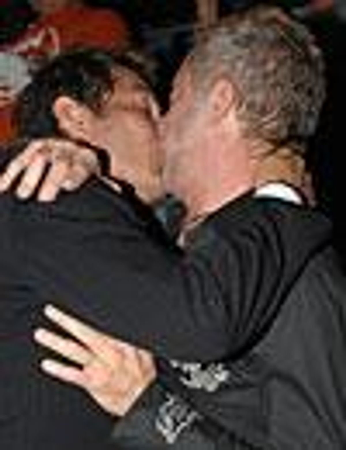 Knight gave a short speech to the crowd -- he's getting really good at his recently adopted role as advocate (political future, maybe?). Joining Knight onstage were West Hollywood mayor Jeffrey Prang, Abbey owner David Cooley, and Robin Tyler and Diane Olson, original litigants in the case heard by the California supreme court that legalized same-sex marriage in the state in May. Tyler announced she and Olsen would be getting married on June 17, the first day licenses will be handed out to same-sex couples. "You're all invited!" Tyler bellowed.