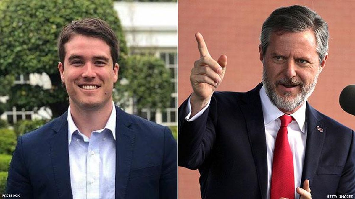 Falwell is president of Liberty University in Virginia, an evangelical Christian institution founded by his notoriously homophobic father. It expects students to adhere to a strict code of sexual conduct, with sex reserved for marriage between "a natural-born man" and "a natural-born woman." Falwell and the school also hold many other far-right positions, including opposition to abortion rights and denial of evolution and climate change.