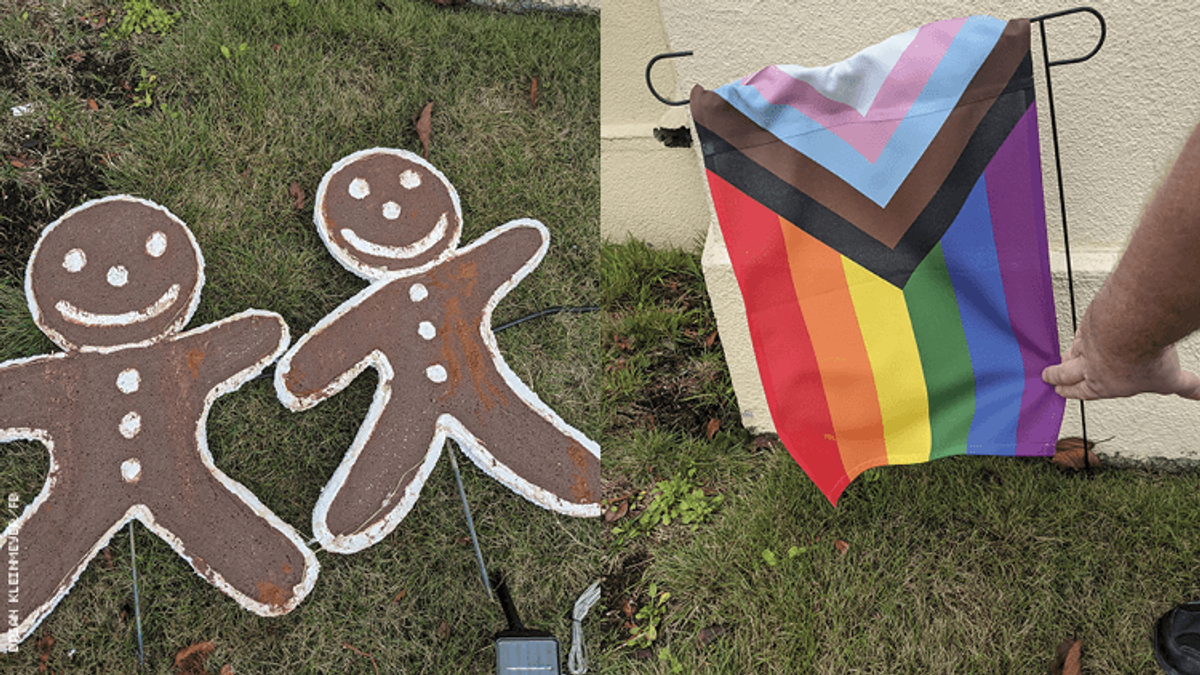 The couple found the gingerbread men they had up in their yard and holding hands had been torn down and placed beneath their gay pride flag. When they looked closer, they realized the gingerbread men had been smeared with feces. Kleinmeyer wrote about the incident on Facebook.