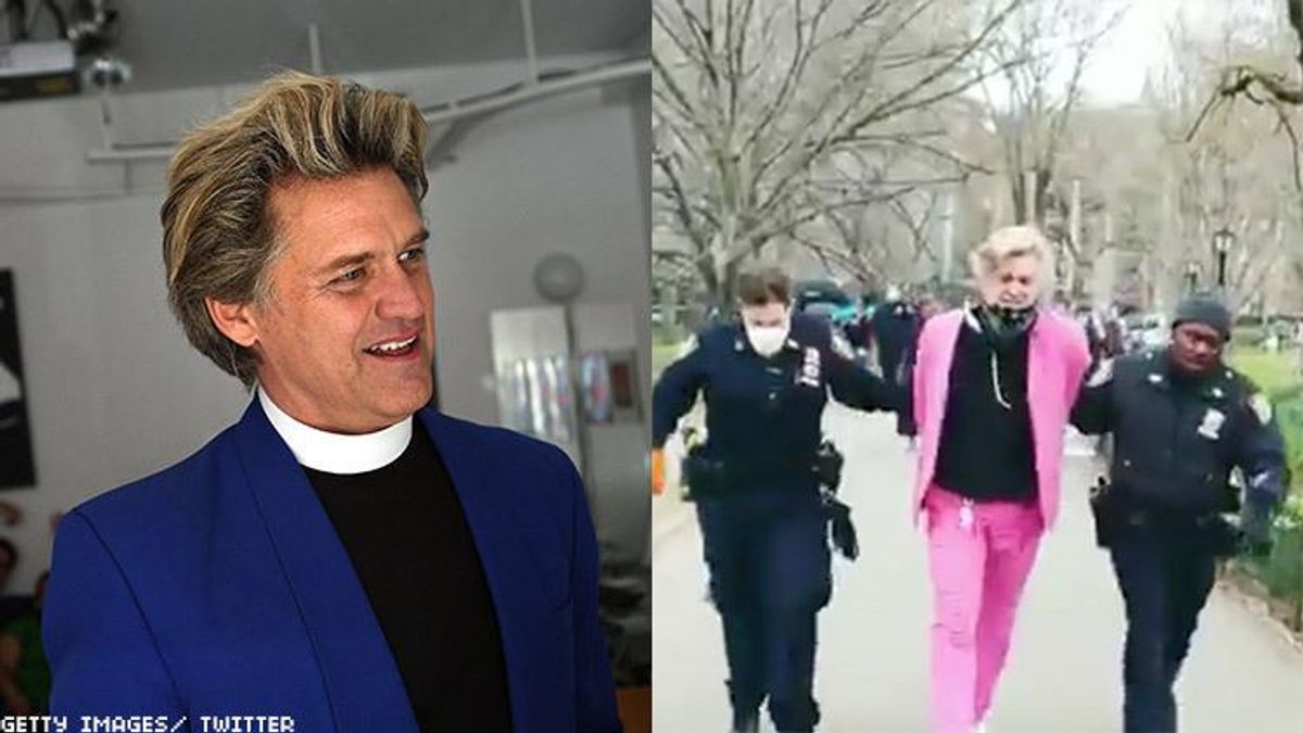 William "Reverend Billy" Talen, an activist and performance artist, was arrested Sunday when he tried to plant a rainbow flag at the New York City COVID-19 field hospital run by anti-LGBTQ minister Franklin Graham's organization.