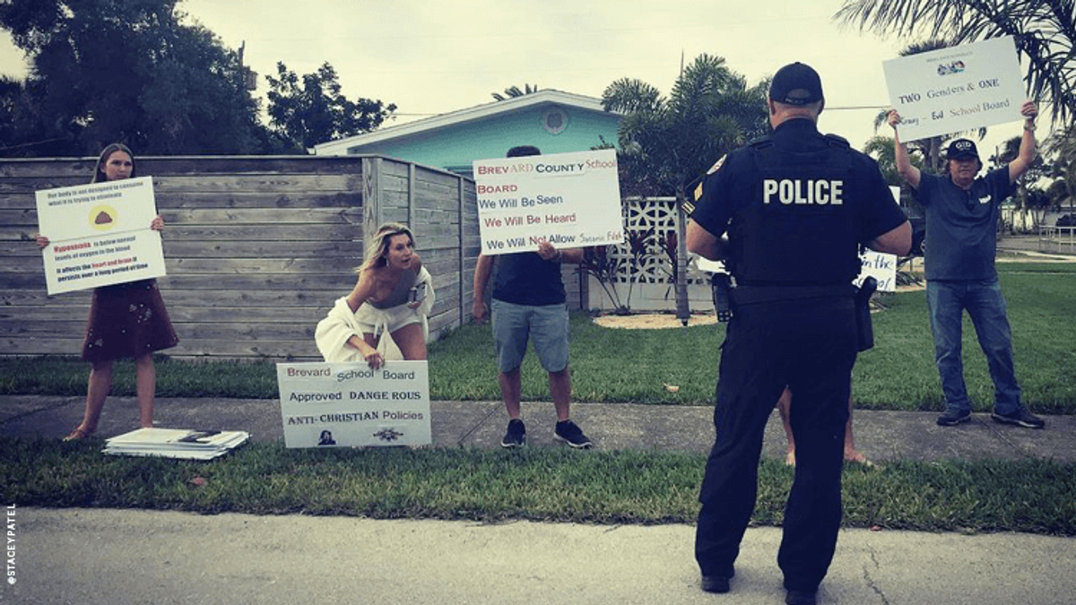 They carried signs with slogans such as "LGBTQ+ Agenda Is Ungodly" and "Two Genders & One Crazy-Evil School Board." Some of the demonstrators were apparently from a group that protested the March 9 school board meeting, such as a man who gave his name as "Thomas Jefferson" and said the participants were "affiliated only with Jesus Christ," according to Florida Today.