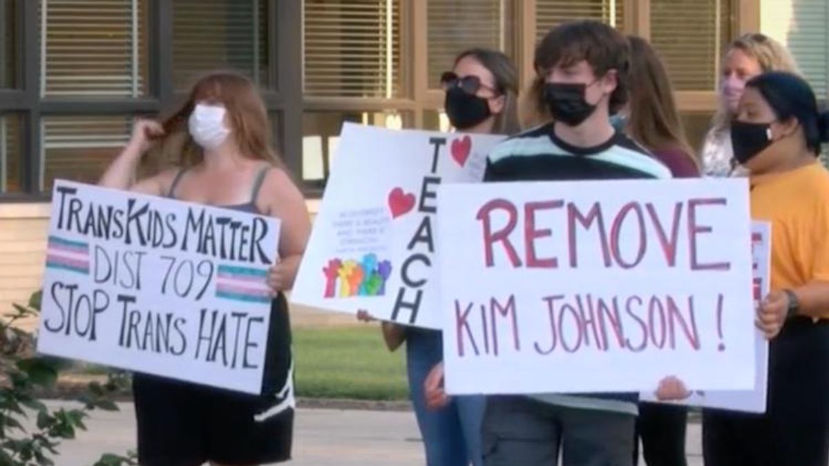 About 30 people protested outside the school Thursday evening against teacher Kim Johnson, and they said problems also come from the school district's administration, citing a board member who'd made transphobic comments on Facebook, Illinois TV station WMBD reports.