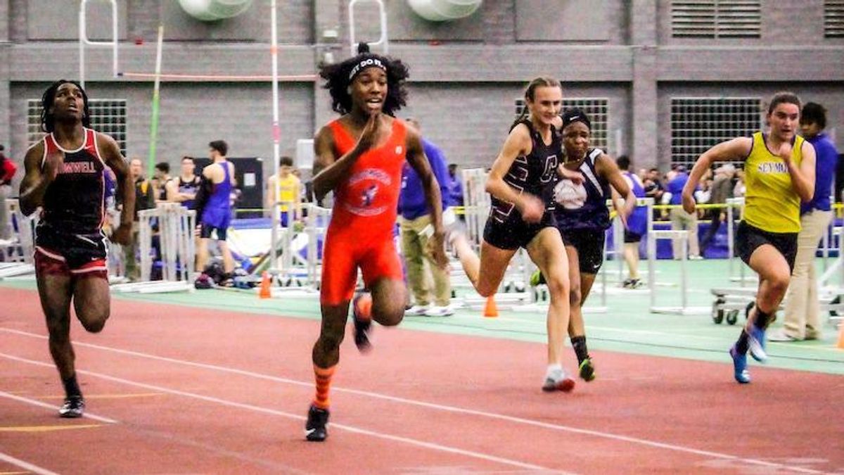 (Image above: Bloomfield High School transgender athlete Terry Miller, second from left, wins the final of the 55-meter dash over transgender athlete Andraya Yearwood, far left, and other runners in the Connecticut girls Class S indoor track meet at Hillhouse High School, in February 2019.)