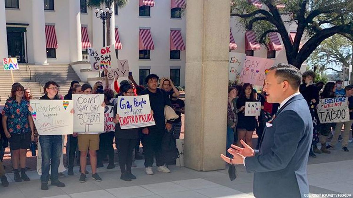 In Tallahassee, students in the afternoon started marching around the Florida capitol in protest of the bill, which already passed in the Florida House and will be considered by the Senate next week. Students ended up filing around the entrance to the House and Senate floor, waving rainbow flags and cheering, "We will not be victims."