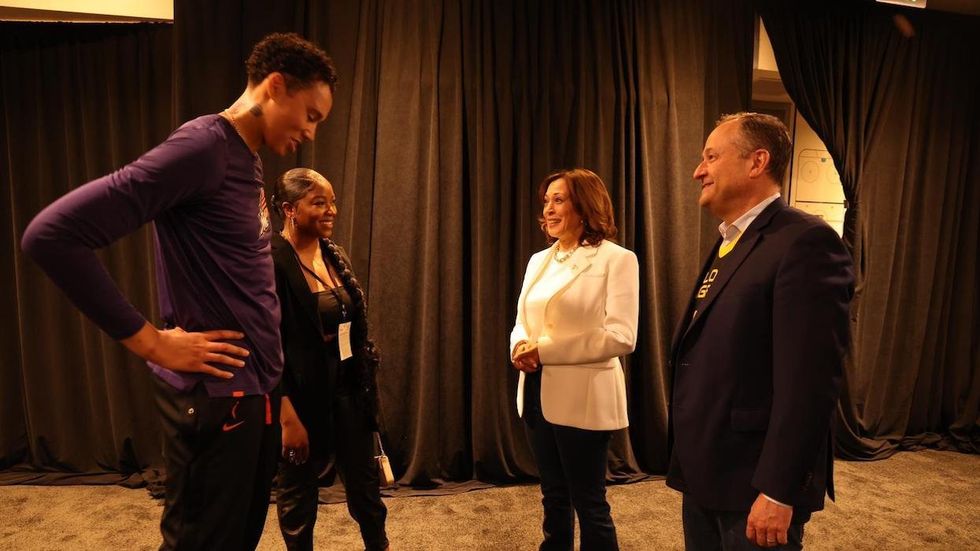 The second couple joined Griner and her team in the Mercury locker room shortly after Harris, Emhoff, and the Griners had their private one-on-one.