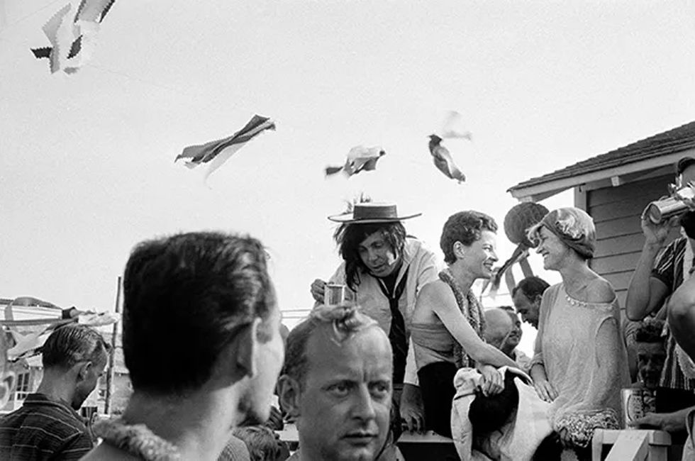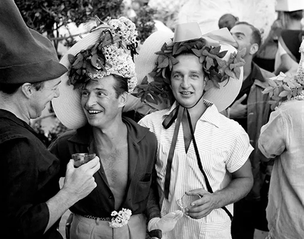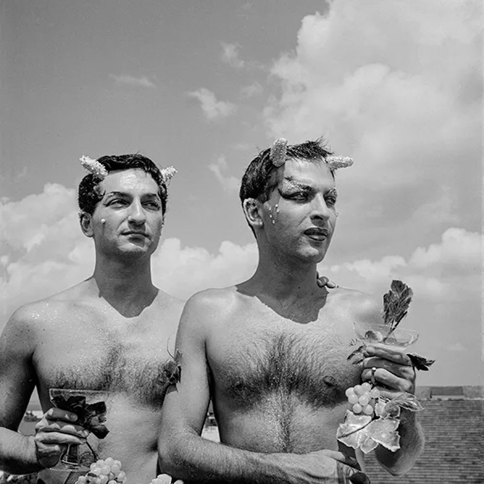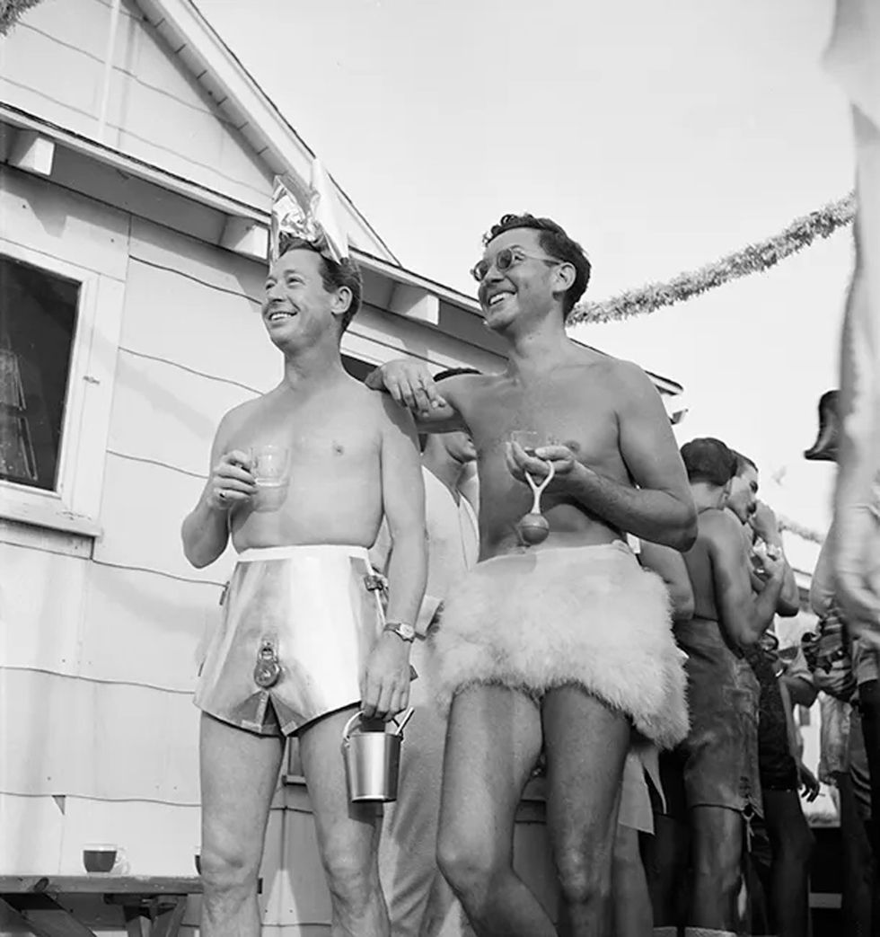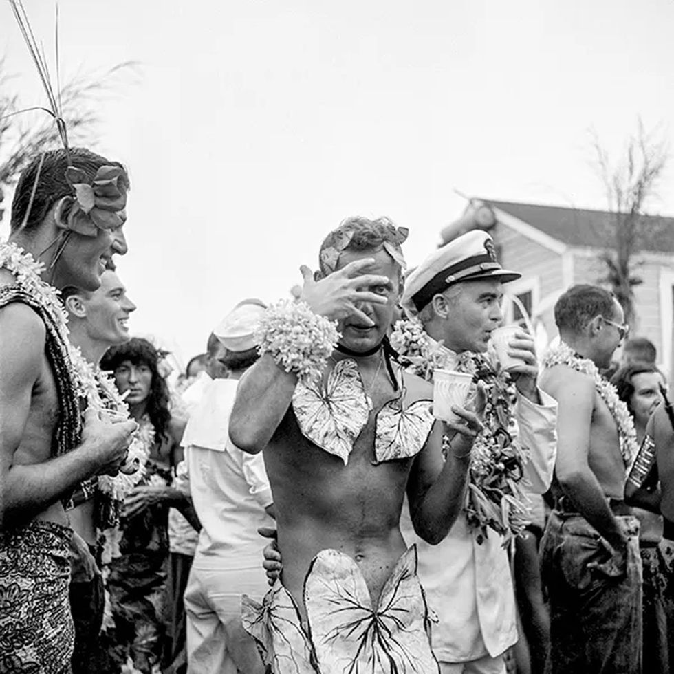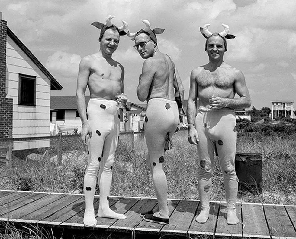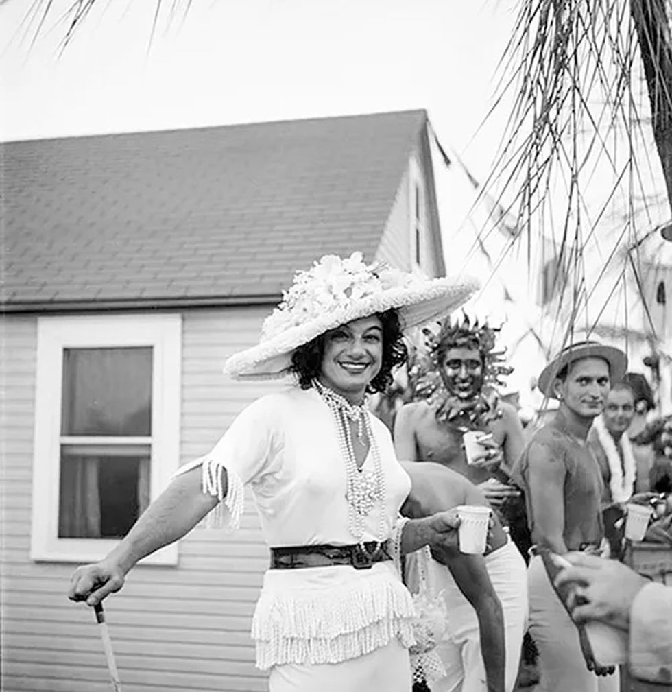 Writers, artists, dancers, theater people, and Hollywood celebrities had been drawn to the Grove since the 1930s. Gay people became the majority of the population during the 1950s and joined with local straight families to work in community organizations. Visitors to the Grove took pleasure in the costumed parties, theatrical events, and liberated atmosphere that this gay sanctuary provided. A sense of togetherness could be felt at campy Cherry Grove costume parties where attendees, straight and gay, showed off flamboyant outfits that would have otherwise been considered a violation of New York laws prohibiting risque attire and cross-dressing. Under the guise of dressing up, many men and women were able to play with gender norms at these fabulous cocktail parties, thereby challenging society's expectations of "proper" behavior. The images on view showcase the abundant creativity in the ebullient social scene. Many Grove house parties were fundraisers for organizations such as the Cherry Grove Fire Department; the Arts Project of Cherry Grove, which organized theatrical productions; the Dune Fund, which preserved the beach dunes; and the Doctor's House, which provided community medical services.