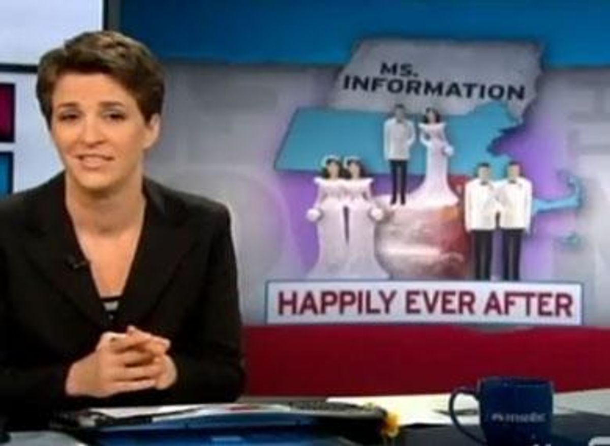 "Despite all the dire warnings, the sky did not fall down the day a man was allowed to marry a man and a woman was allowed to marry a woman in the Bay State," said Maddow, who shares a home in Massachusetts with her partner, Susan Mikula. The couple is not married.