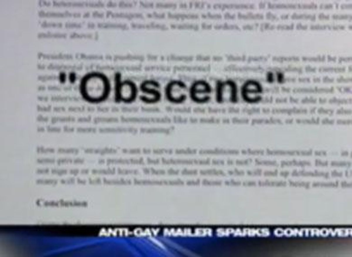According to KKTV, "The Family Research Institute wanted to express its concerns about gays in the military in a bulk newsletter to be mailed out. FRI says local postal officials refused to mail out the newsletter because they deemed the content 'obscene' and 'incited force-able resistance against the government' after a routine check of the mail before it was authorized to be sent out. However, Ron Perry with U.S. Postal Service community relations claims local post office officials never refused to mail it out, they just wouldn't mail it at a reduced nonprofit bulk rate because they believed it violated guidelines stated in the Domestic Mail Manual for obscene content. 'We have mailing standards that we have to uphold,' said Perry."