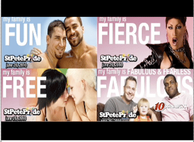 One of the ads featured two men without shirts, with the copy reading, "My Family is Fun." The other billboard shows a lesbian couple at the beach, with copy that reads, "My Family is Free."