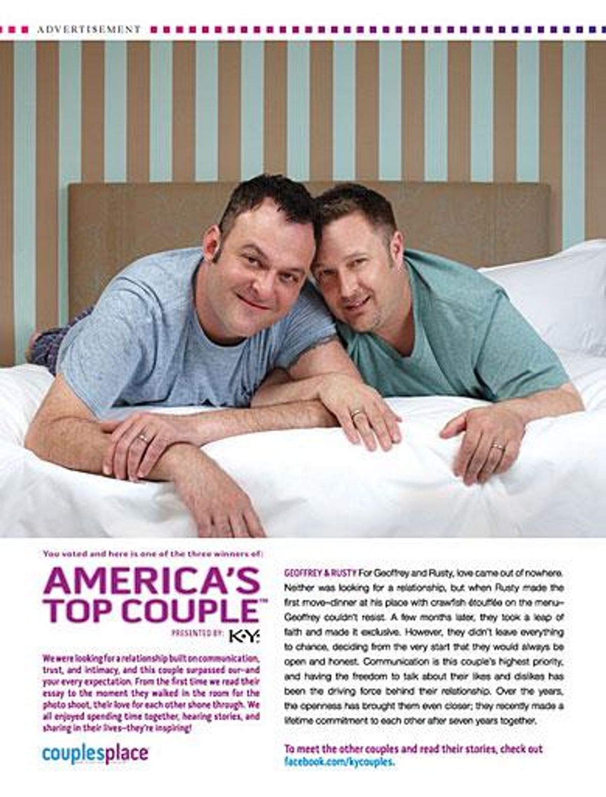 Geoffrey and Rusty were chosen as America's Top Couple and are featured in an advertisement in the current issue of Entertainment Weekly. The title comes courtesy of K-Y's CouplesPlace page on Facebook, where couples entered a contest, telling K-Y about why their level of trust, intimacy, and communication makes them America's Top Couple.