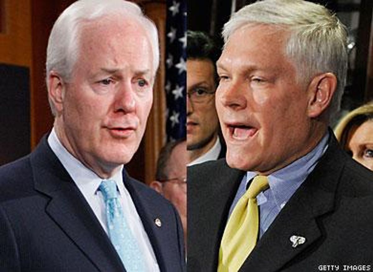 Both politicians object to same-sex marriage and the repeal of "don't ask, don't tell." On Tuesday, Cornyn told The Hill he believed Senate majority leader Harry Reid's attempt to consider repeal as a part of the defense spending bill was a "cynical and politically transparent move."
