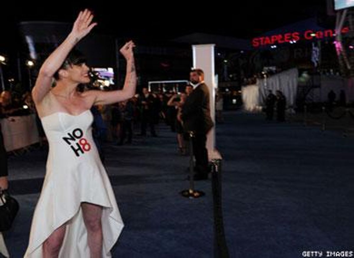 Perrette's NoH8 dress was designed in a collaboration with her favorite designer, Terri King.