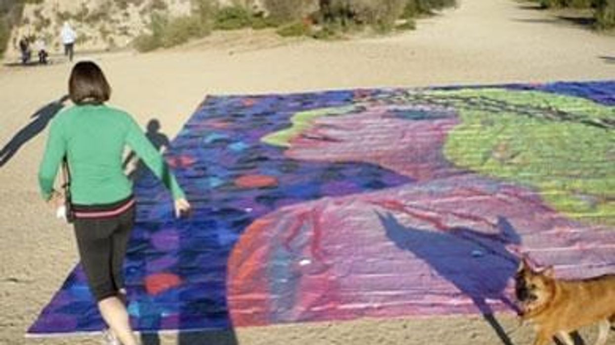 "I took pictures of what looks like an gigantic painting of Lady Gaga with a crown of thorns on her head with blood. The painting is laying flat all the way on top of the hill near by the benches..."