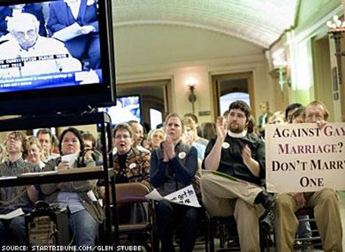 Voting 8-4, Minnesota's GOP-controlled senate judiciary committee green-lit the legislation after two hours of debate and an hour-long debate between senators, reports the Minnesota Star-Tribune. Previous efforts by Minnesota's senate to pass a constitutional ban on gay marriage -- the state already outlaws marriage equality, though the ban is not yet written into the constitution -- have failed, but Republicans gained an upper hand in the past election. Both the senate and house of Minnesota are Republican-controlled, while the governor, Mark Dayton, is a Democrat.