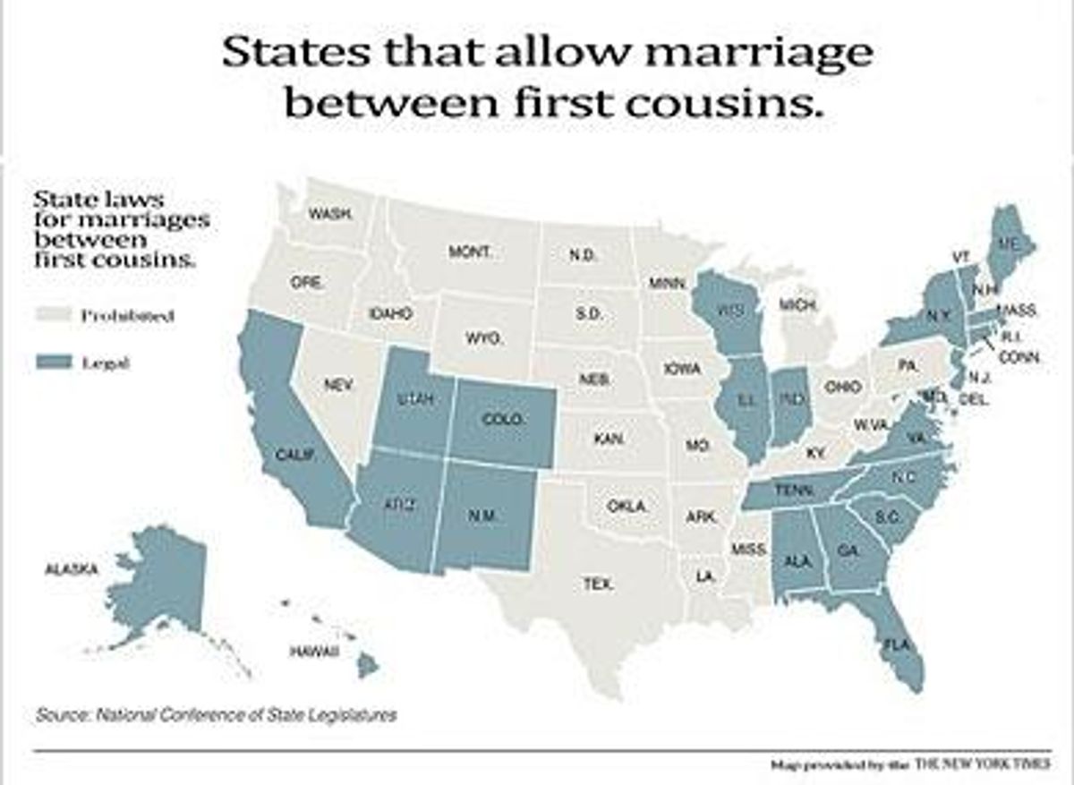 Of the 50 states, 19 (including California, Alaska, New York, and Florida) permit restriction-free marriages between first cousins, while only five (Connecticut, Iowa, Massachusetts, New Hampshire, and Vermont, plus the District of Columbia) allow people to marry someone of the same sex.