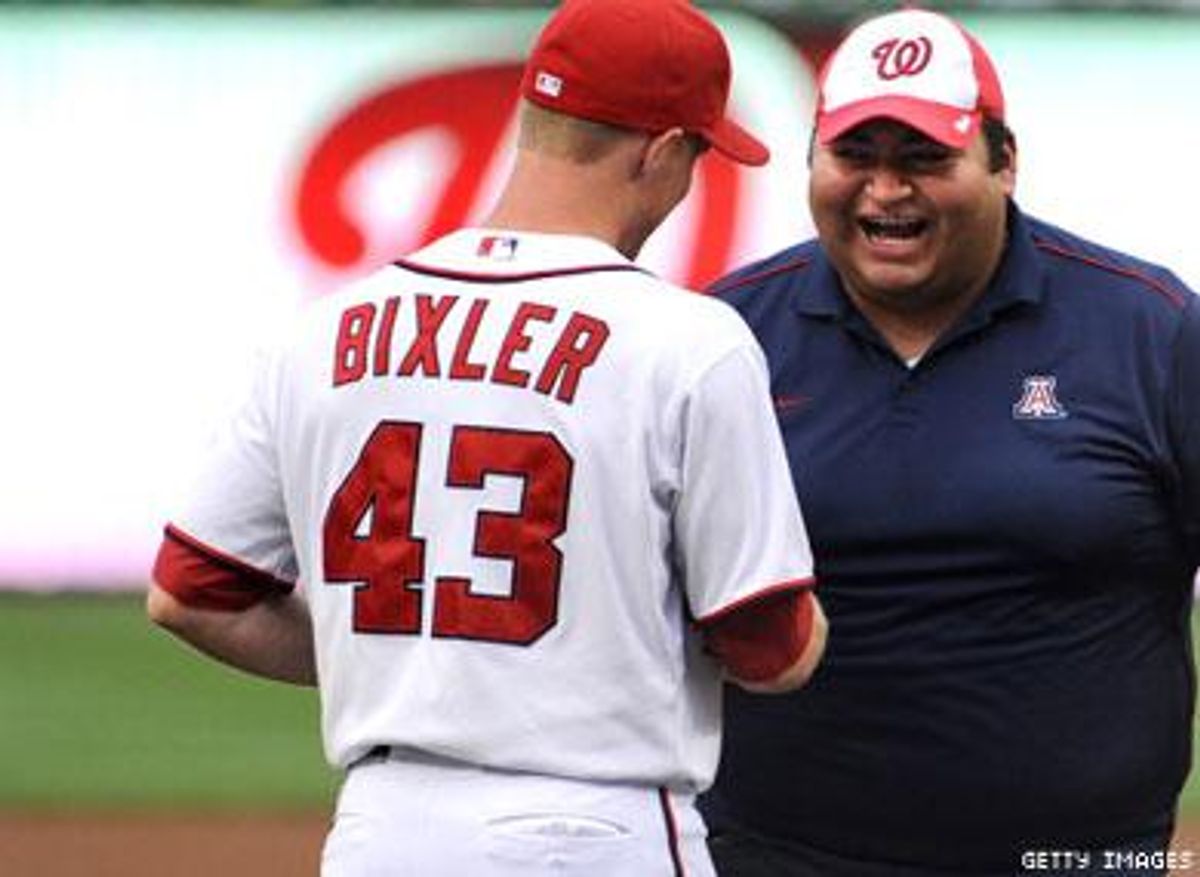 Daniel Hernandez, who made news in January as the intern who saved Congresswoman Gabrielle Giffords's life, helped kick off an annual gay event in Washington, D.C., by throwing the first pitch at Tuesday's Washington Nationals game.
