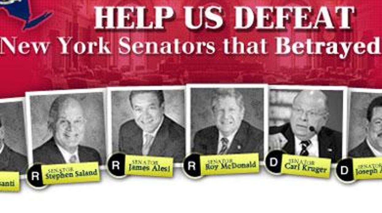 As one anti-gay marriage group sees it, they make up the bulk of "New York Senators That Betrayed Marriage." Their bio photos appearing, black-and-white, in a newly minted flier, the four Republican senators who voted in favor of marriage equality Friday are a prime target of a campaign launched by the National Organization for Marriage -- one that claims to be pouring at least $2 million into the battle.