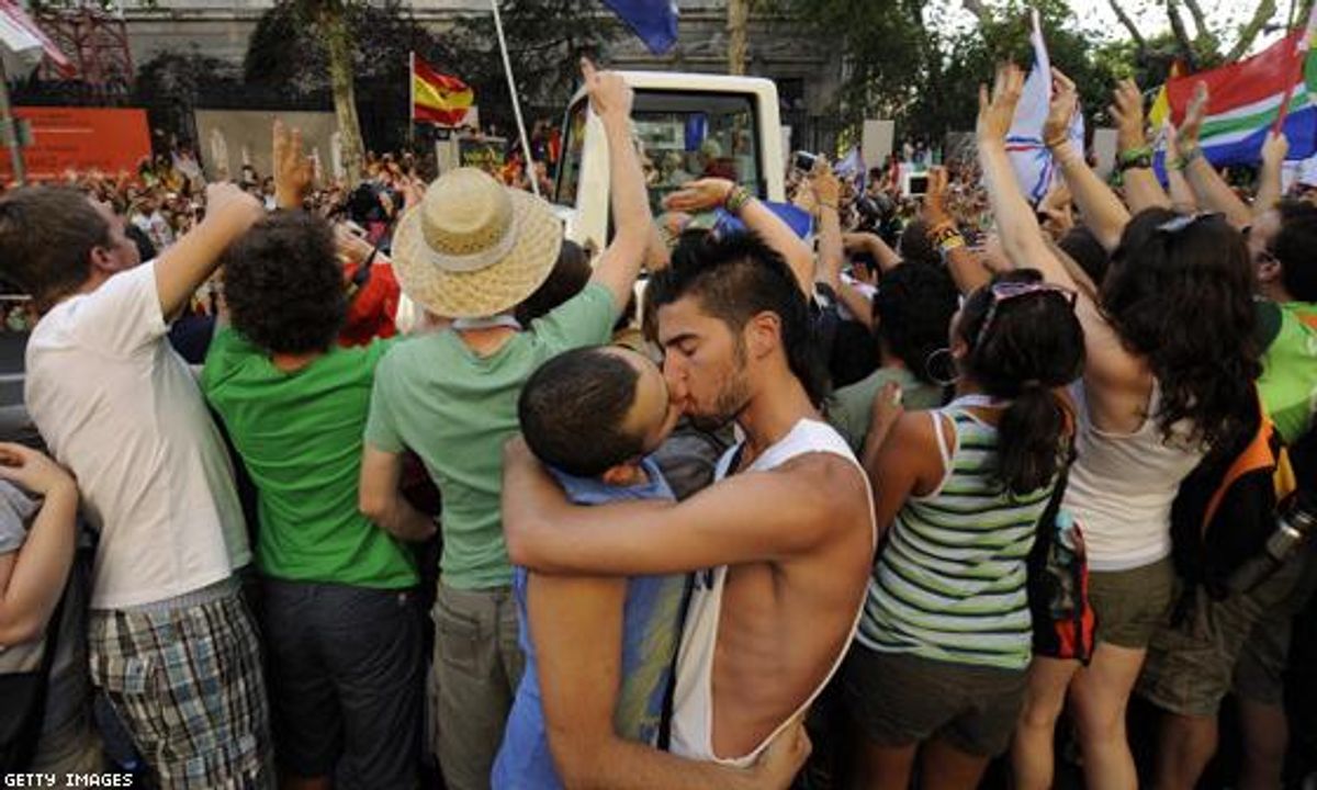A gay couple lock in a kiss while the Popemobile passes through the streets of Madrid. They were what was left of a foiled "kiss-in" protesting the Roman Catholic Church's "moral condemnations of sexuality," according to a Facebook page used to organize.