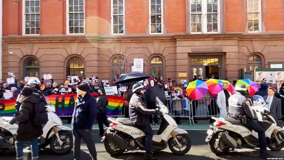 Outside, detractors and supporters of the LGBTQ+ community shouted angrily at each other.