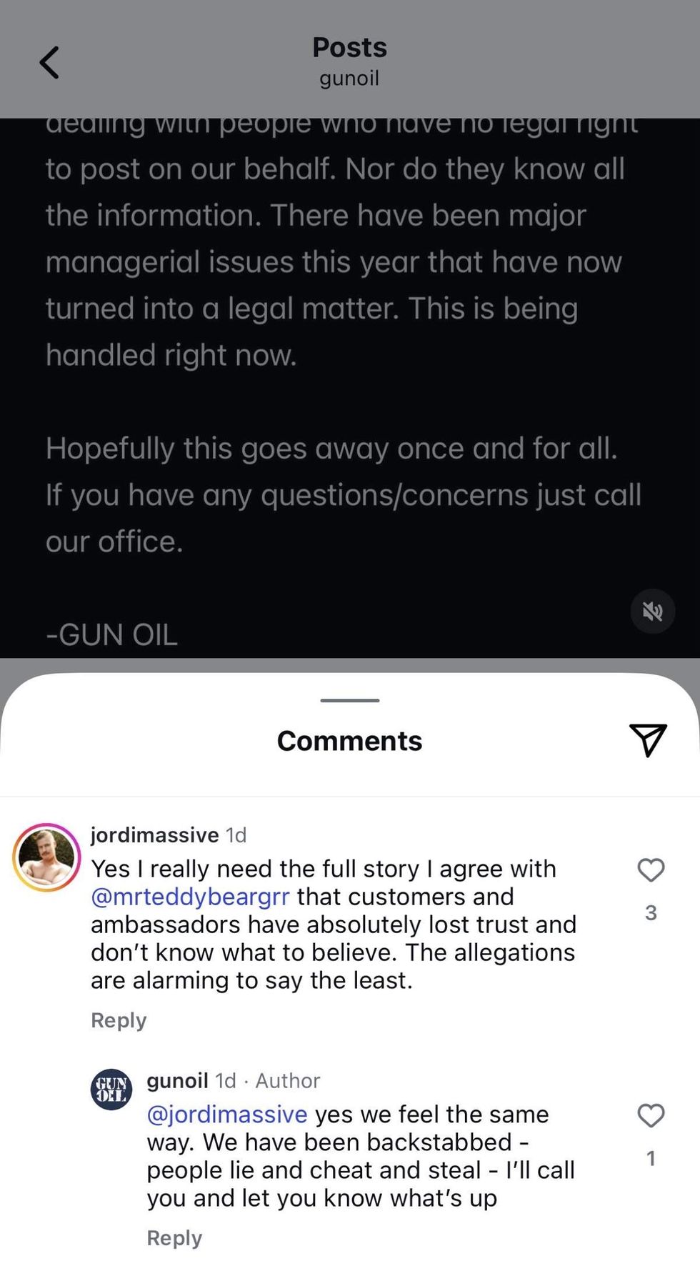 "Dear GUN OIL fans, we are terribly sorry about all the crazy posts over the past few weeks. We are dealing with people who have no legal right to post on our behalf. Nor do they know all the information. There have been major managerial issues this year that have now turned into a legal matter. This is being handled right now. Hopefully this goes away once and for all. If you have any questions/concerns just call our office."