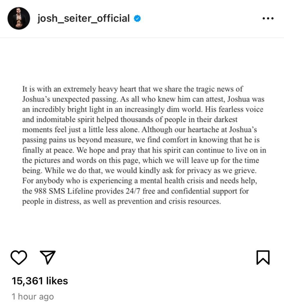 The Monday post began, “It is with an extremely heavy heart that we share the tragic news of Joshua’s unexpected passing.” It went on to call Seiter “an incredibly bright light in an increasingly dim world” and asked for privacy for his loved ones. It did not state a cause of death but included a number for a crisis hotline.