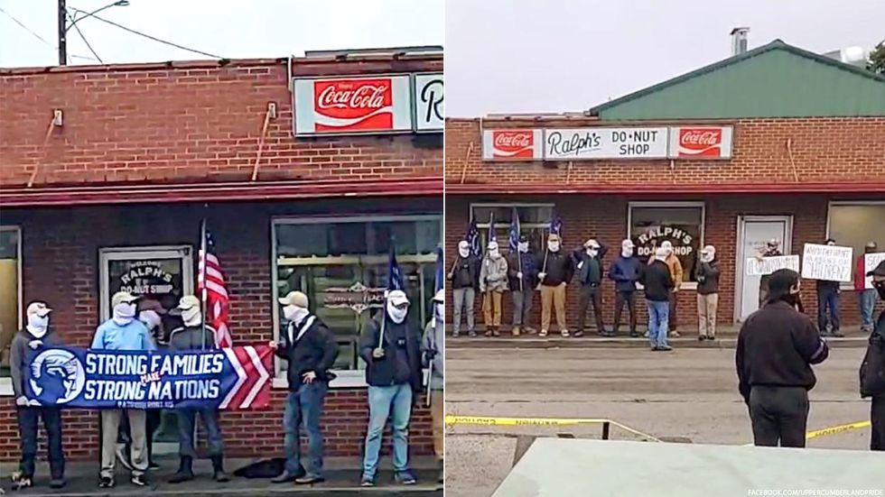 Wearing white masks and holding a sign popular with the group Patriot Front, about two dozen men stood across the street from Hix Farm Brewery, chanting homophobic slurs, Nashville’s public radio station WPLN reported.