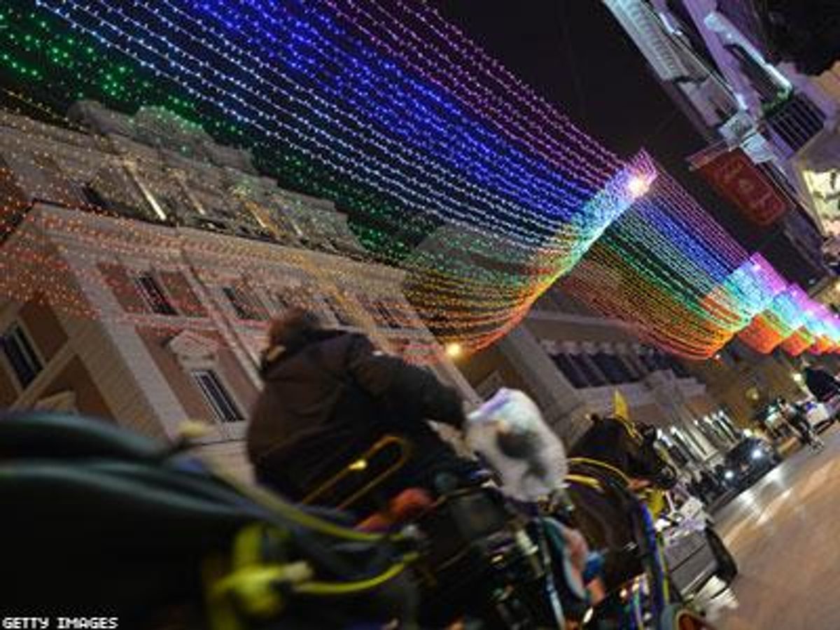 Strands of red, orange, yellow, green, blue, indigo, and violet light up the night sky for nearly a mile in the Via del Corso, spanning from Piazza Venezia to Piazza del Popolo. Agence France-Presse reports that Mayor Ignazio Marino and Assemblywoman Imma Battaglia, who also leads an LGBT rights group, intended to send a message about acceptance in response to public outcry over the suicides of at least three gay Italian teenagers earlier this year.